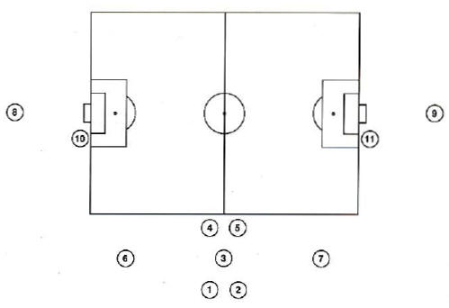 We further distinguished between collective and individual play, and also between play and position of waiting for the ball. We singled out the protagonists of every action in the game, both on and off the pitch. In the end, we had our coverage alphabet. In parallel with this research, we experimented freely with three or four cameras and one or two replay machines, using single cameras or groups of cameras as part of a hypothetical complete layout (Right: some examples of camera positions).